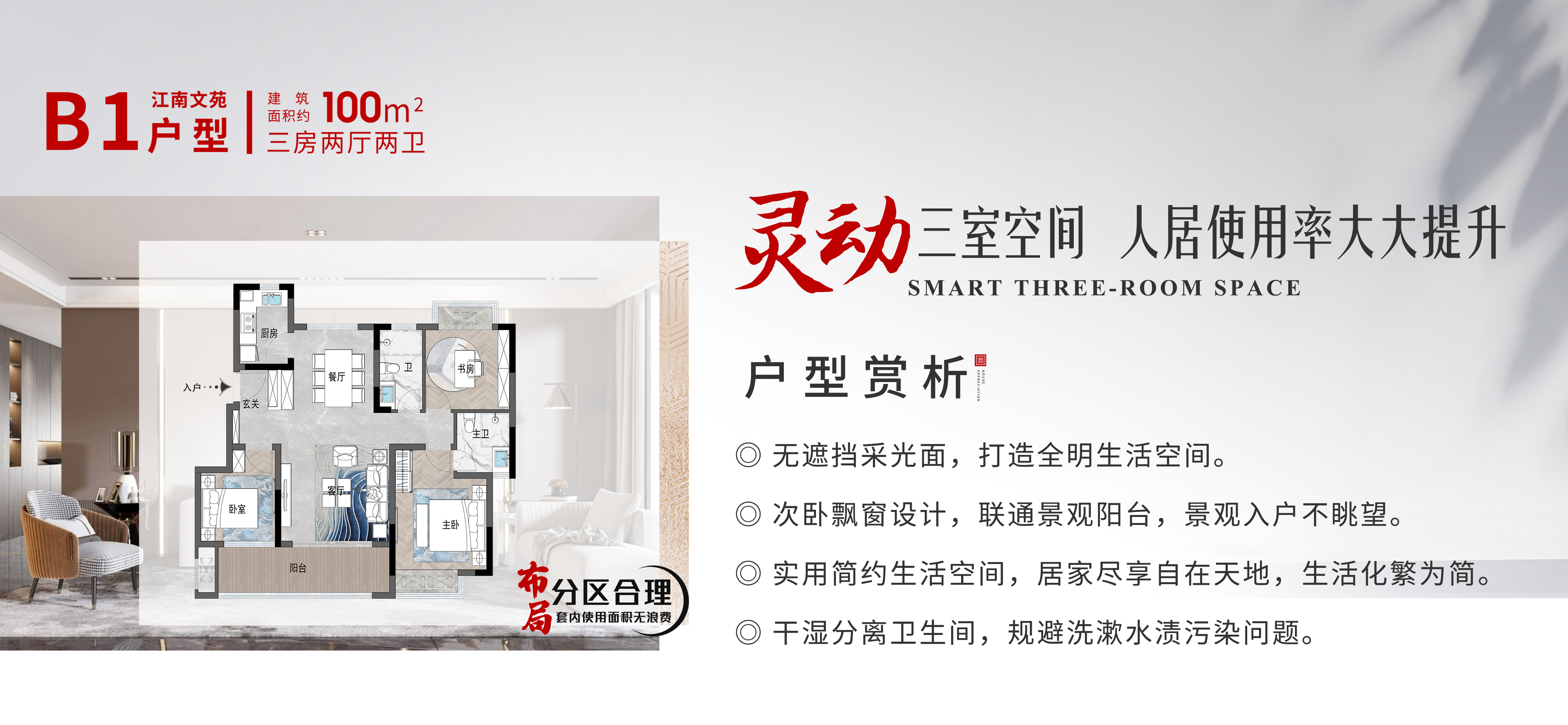 灵动三室空间 人居使用率大大提升 ●无遮挡采光面,打造全明生活空间。 ●次卧飘窗设计,联通景观阳台,景观入户不眺望。 ●实用简约生活空间,居家尽享自在天地,生活化繁为简。 ●干湿分离卫生间,规避洗漱水渍污染问题。